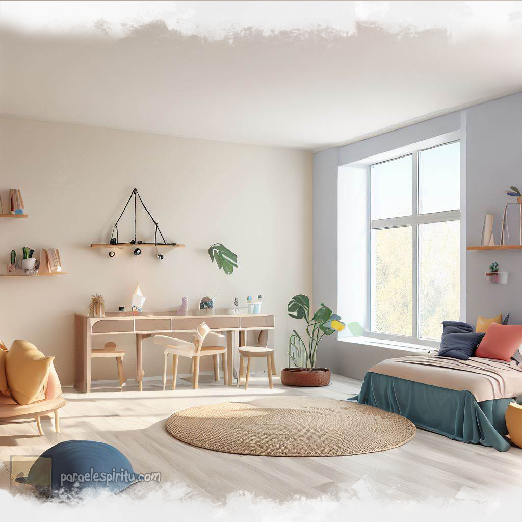 6) Estudio : Lo ideal es que el lugar de estudio se encuentre separado del lugar de juego y de descanso. Si esto no es posible, hay que procurar una separación virtual que puede lograrse, por ejemplo, utilizando un color diferente para el rincón  de trabajo : un azul cielo puede ser perfecto para dar calma y concentración. Está demostrado que los niños aumentan su rendimiento en un entorno con variedad de colores. Evitar los colores neutros (blanco, negro, gris) y los marrones. Hay que disponer de suficiente espacio para guardar todo lo que tenga que ver con estudios una vez finalizada la tarea.